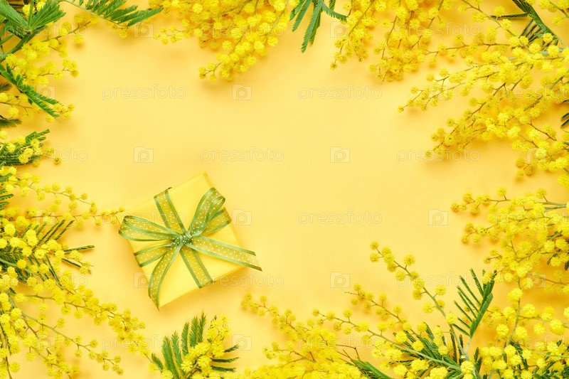 Желтая рамка цветов мимозы с подарочной коробкой. Женский день, пасха, весенняя композиция. Вид сверху с копией пространства