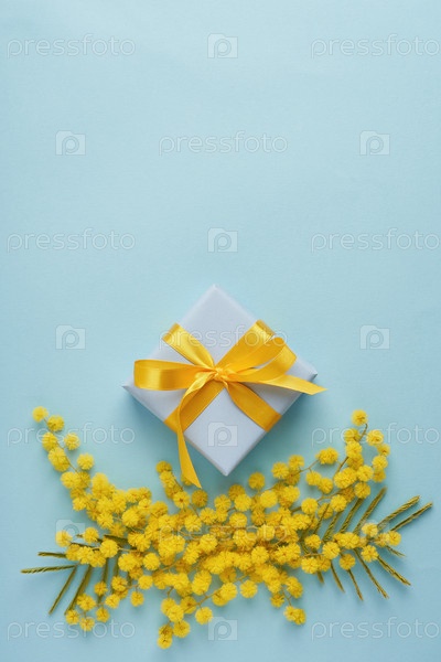Весенние цветы мимозы с подарочной коробкой на синем фоне, поздравительная открытка на День матери, 8 марта, Пасха. Вид сверху, плоская планировка, пространство для копирования. Вертикальный