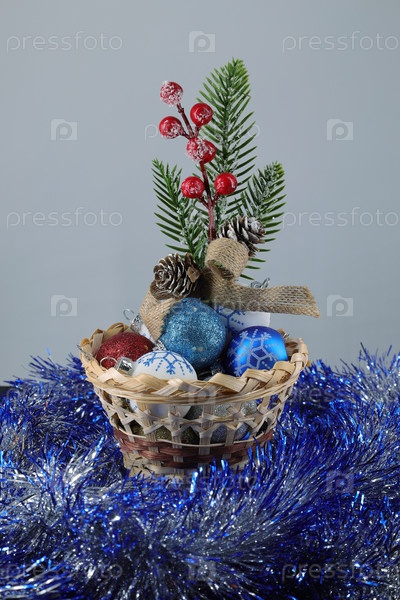 Елочные шары и еловая ветка в плетеной корзине в окружении мишуры