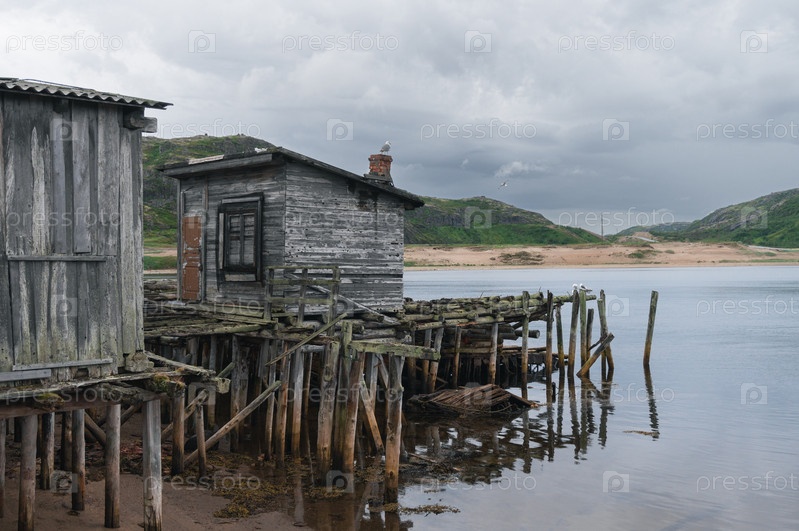Деревянные дома на сваях в воде. Териберка, Россия