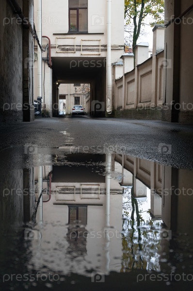 Отражение дома в луже на асфальте. Двор в Санкт-Петербурге, Россия