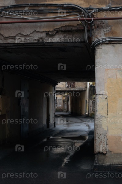 Проход под аркой желтого дома. Лужи на асфальте. Двор в Санкт-Петербурге, Россия