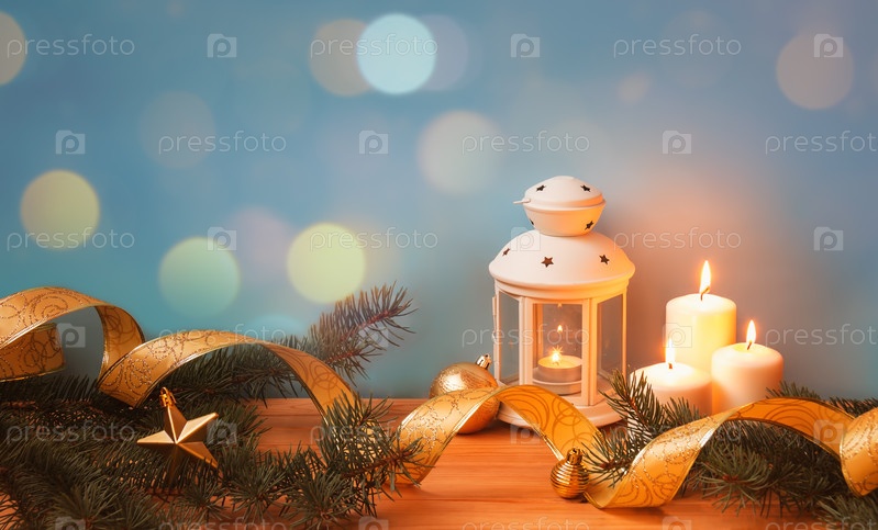 Белый фонарь, свечи, декоративная лента, рождественские украшения и еловые ветки. Выборочный фокус. Просмотр с копией пространства