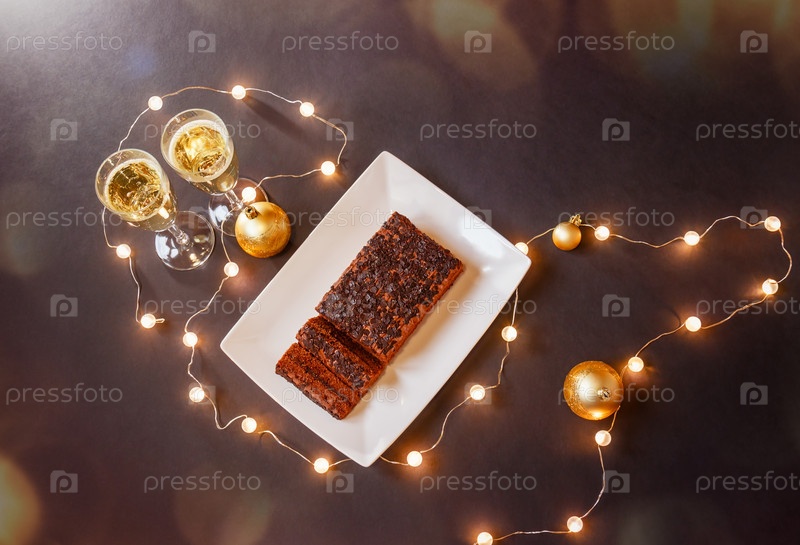 Шампанское, шоколадный торт, елочные шары и светящиеся рождественские огни. Вид сверху