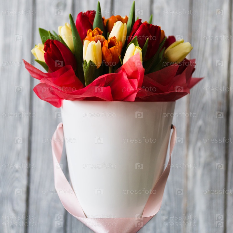 Белый цветочный горшок из красных желтых оранжевых тюльпанов с красными и розовыми лентами на сером деревянном фоне