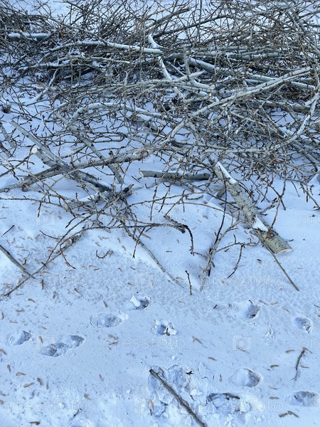 Отрубленные ветки деревьев лежат на снегу рядом со следами