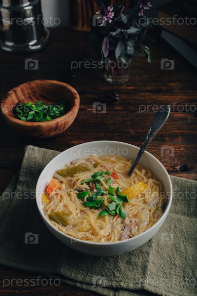 Суп-лапша с мясом утки и овощами