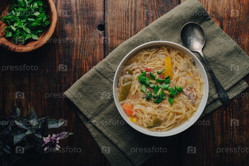Миска супа с лапшой с овощами и уткой