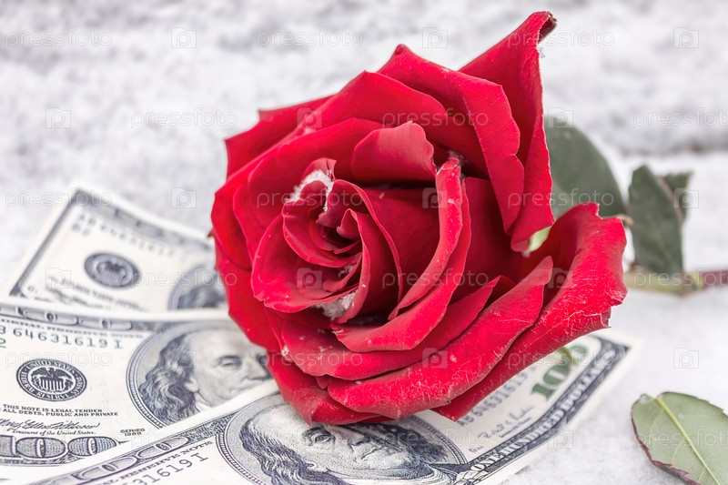 Замороженная красная роза лежит на банкнотах в снегу в парке