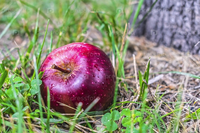 Большое красное и спелое яблоко упало с дерева на землю