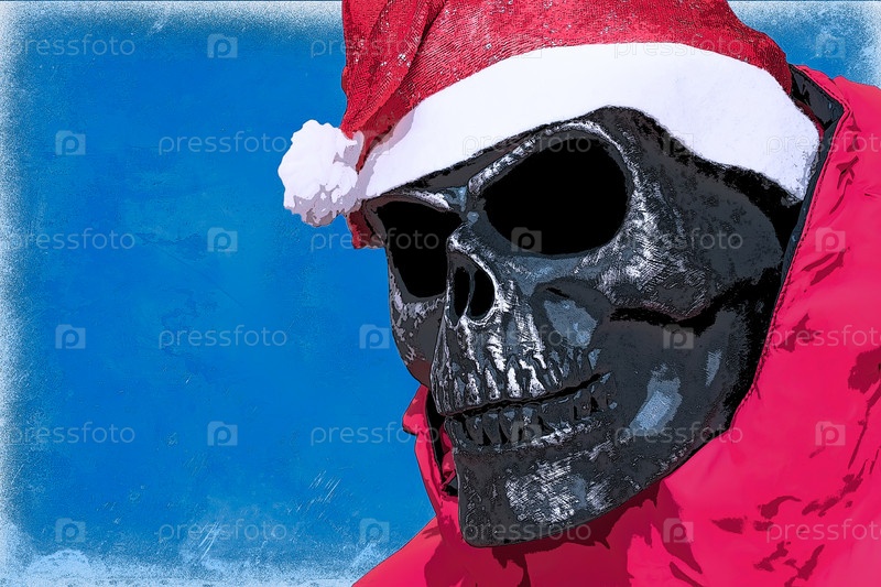 Иллюстрация Нарисованный череп в образе злого Санта-Клауса на синем фоне