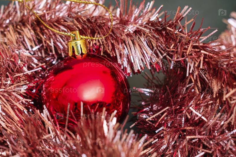 Ярко-красный елочный шар и мишура для украшения в новогодние праздники