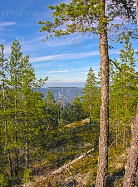 Сосновый лес на берегу Белого моря. остров Горелый, Керетская губа, Кандалакшкий залив, Карелия. Солнечный день в июле
