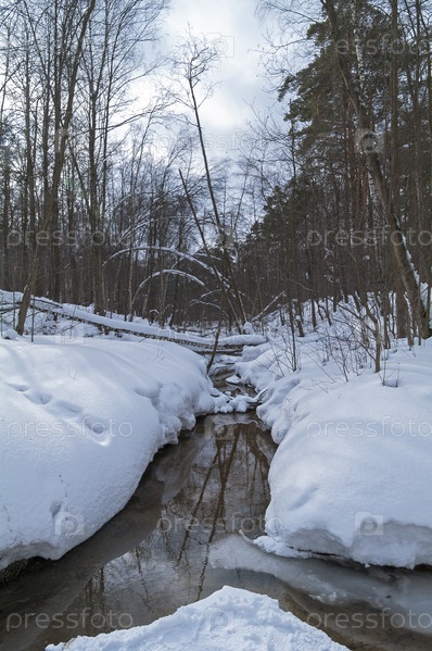 Ручей в зимнем лесу. Начало марта. Битцевский лес, Москва. Верховья реки Чертановка
