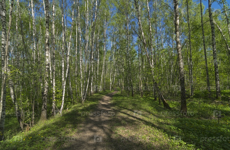 Тропинка в весеннем лесу. Узкое, Битцевский лесопарк, Москва. Солнечный день в мае