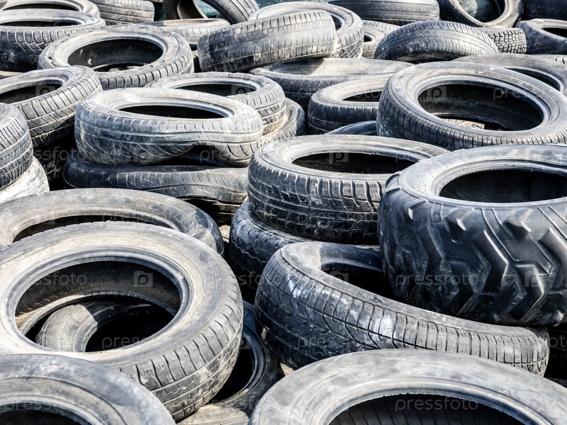 Большая куча свалки шин. Незаконная свалка мусора. Концепция загрязнения экологии
