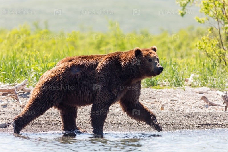 Пораненный бурый медведь (Ursus arctos beringianus) идет вдоль озера Камчатка, Россия
