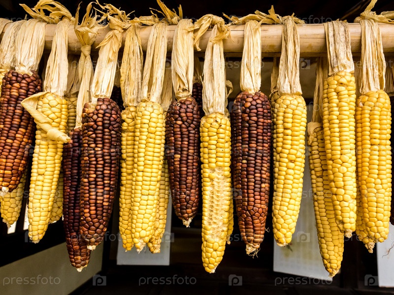Спелые кукурузные початки сушат на солнце. Органическая натуральная веганская еда