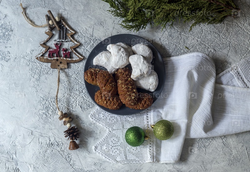 Национальное, рождественское греческое печенье "меломакарона" и "кураби"