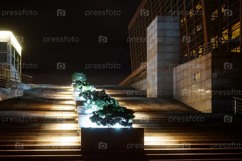 Владивосток, Россия - 18 августа 2019 г.: Ночной пейзаж с видом на архитектуру Мариинского театра, освещение украшает современное здание