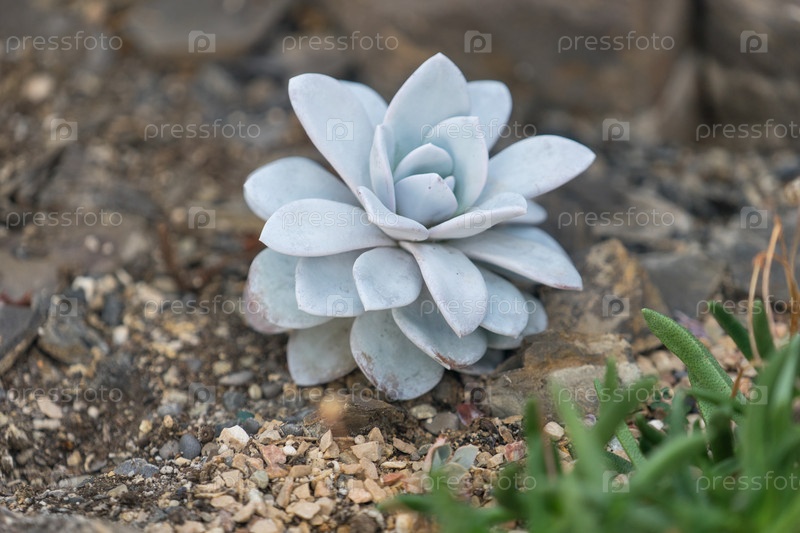 Естественный фон с красивым сочным серо-зеленым цветком на каменистой почве