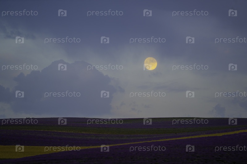Пейзаж с лавандовым полем и луной в вечернем небе