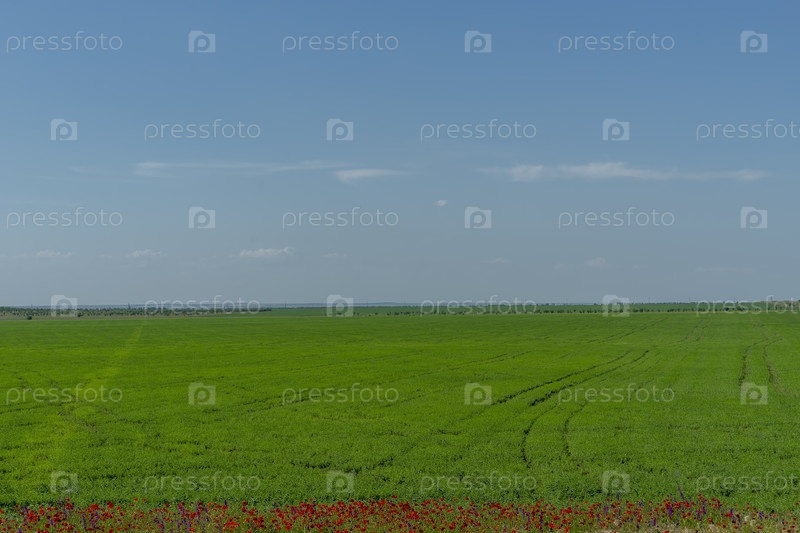 Природный ландшафт с зеленым полем под голубым небом