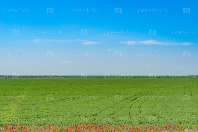 Природный ландшафт с зеленым полем, красными маками на краю и голубым небом