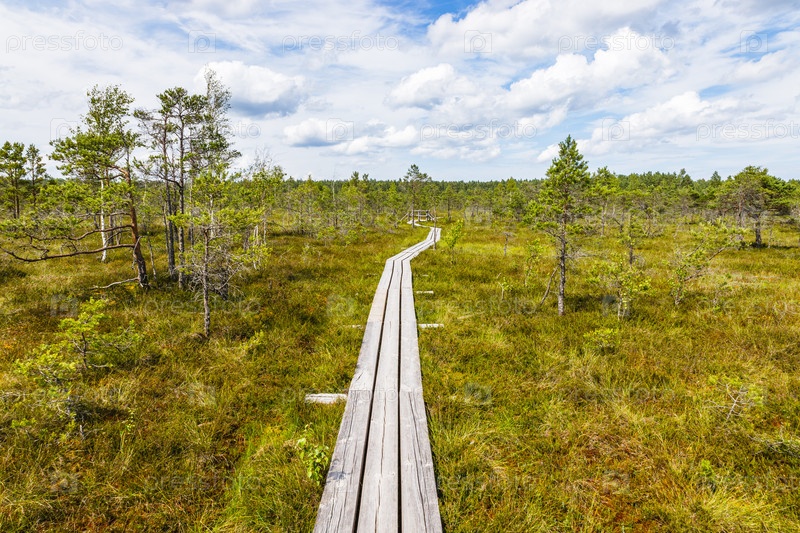 Деревянная прогулочная тропа проходит через небольшие пруды на болоте. Большое Кемерское болото