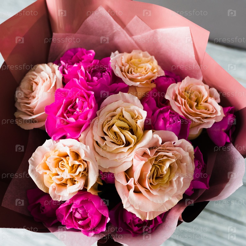 Бургундский букет с белыми и розовыми розами стоит в белой подставке на сером деревянном столе