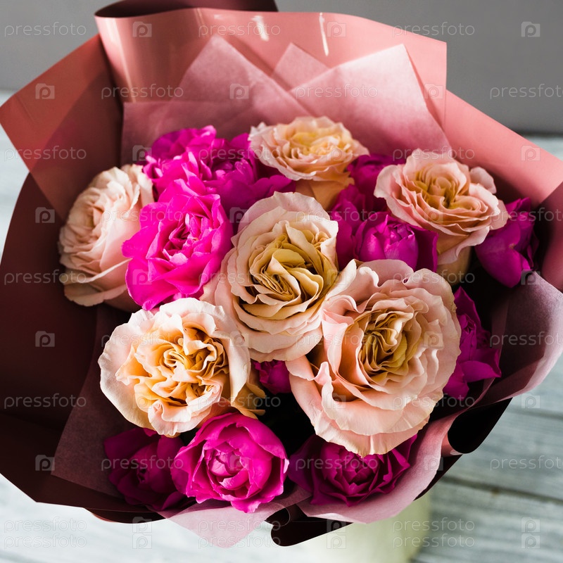 Бургундский букет с белыми и розовыми розами стоит в белой подставке на сером деревянном столе