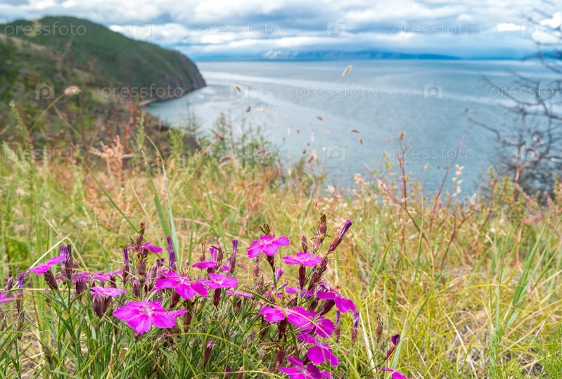 Вид на альпийские розовые цветы на фоне озера Байкал и мыса Хобой. Остров Ольхон, Россия. Мягкий фокус с точкой фокусировки на растении