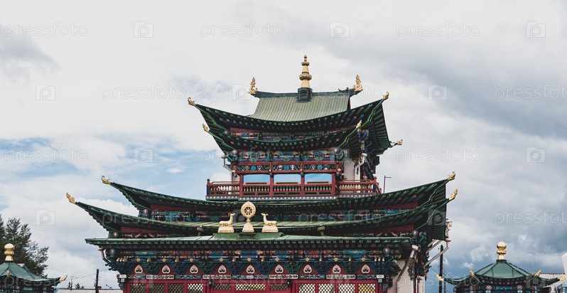 Вид на храм Этигель Хамбин на территории Иволгинского дацана, Республика Бурятия. Центр буддизма в России