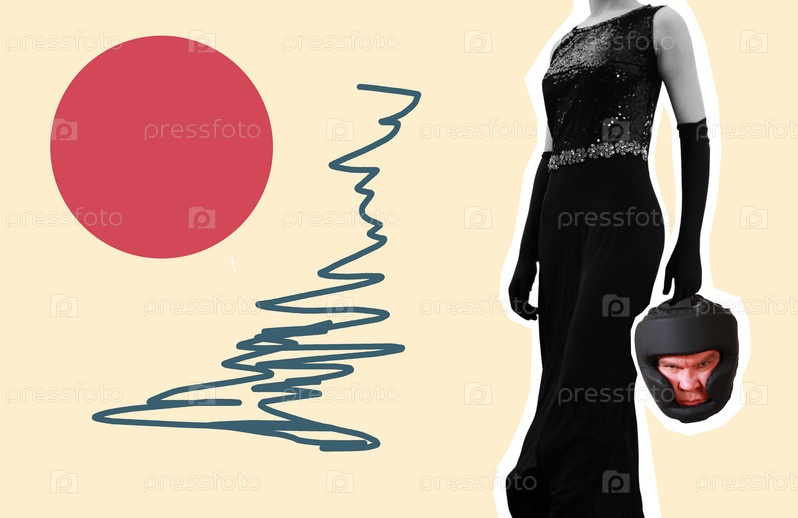 Современный творческий коллаж. Красивая женщина держит отрубленную голову мужчины как трофей. Концепция отношений мужчины и женщины