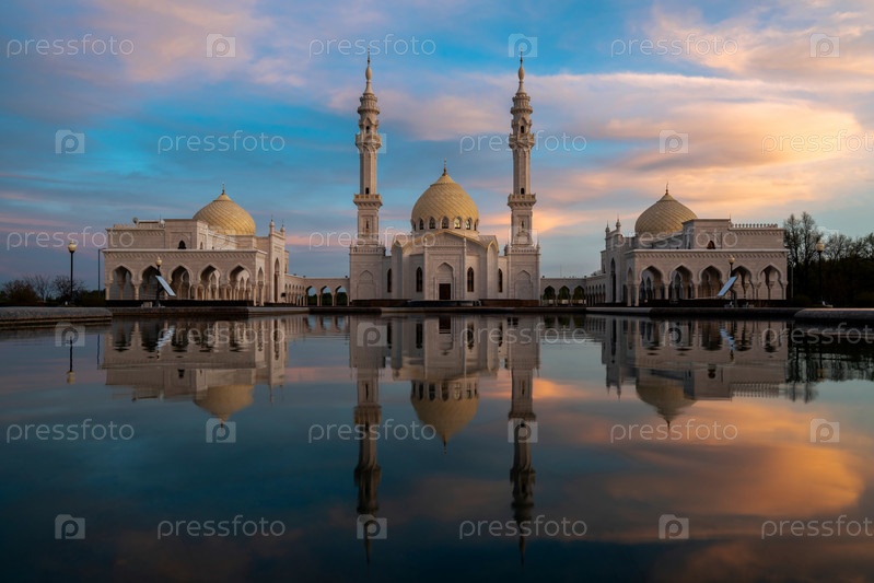 Белая мечеть древнего города Болгар с отражением в воде на фоне закатного неба. Болгар, Республика Татарстан, Россия