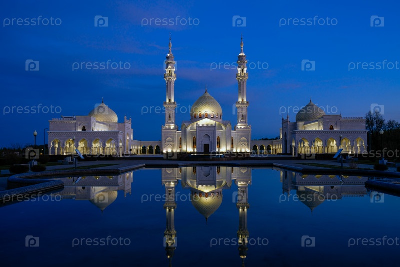 архитектура; болгар; здание; город; культура; знаменитость; освещение; ислам; достопримечательность; минарет; мечеть; ночь; ночное освещение; отражение; религия; религиозность; россия; россия; небо; закат; татарстан; туризм; путешествия; вода; белая; белая