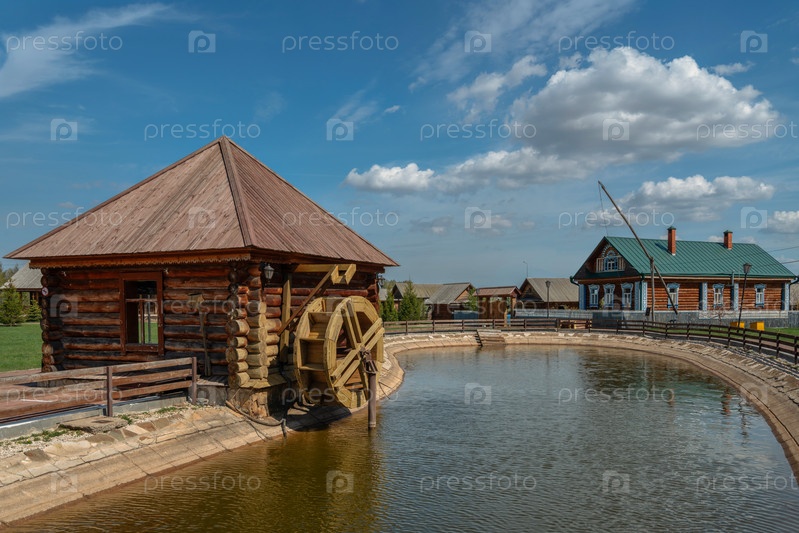 Водяная мельница и дом мельника в музее истории земледелия и производства хлеба в солнечный день, Болгар, Республика Татарстан, Россия