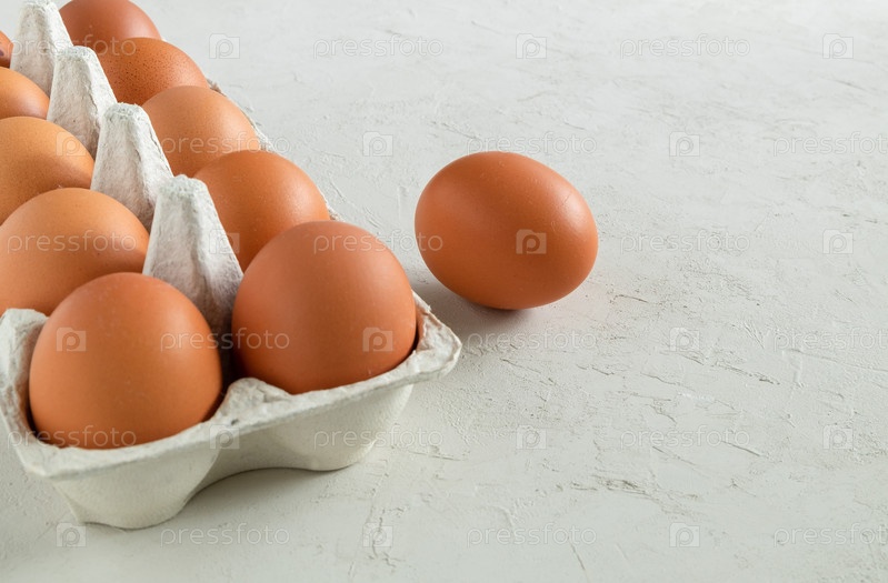 Картонный контейнер с коричневыми куриными яйцами на светло-серой гипсовой поверхности. Здоровое питание, концепция питания