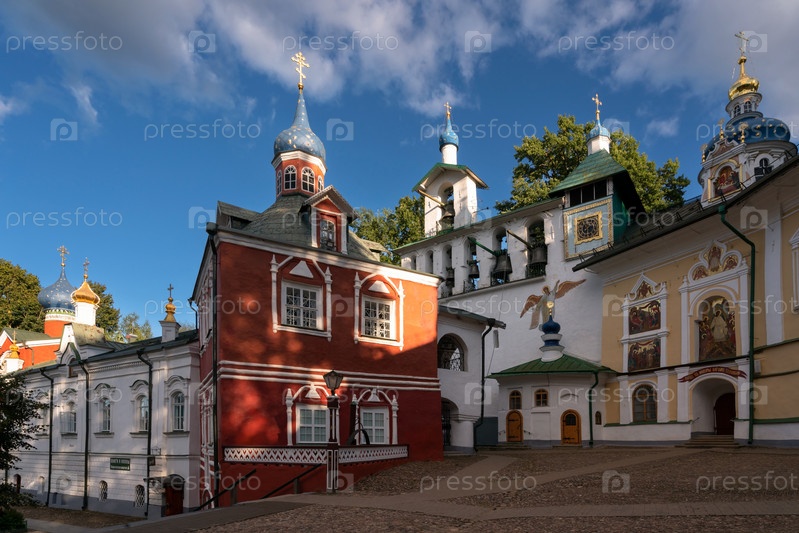 Вид на Успенский собор, Большую колокольню и ризницу Свято-Успенского Псково-Печерского монастыря, Печоры, Псковская область, Россия