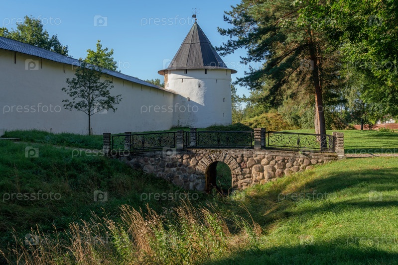 Вид на Тайловскую башню Свято-Успенского Псково-Печерского монастыря в солнечный летний день, Печоры, Псковская область, Россия
