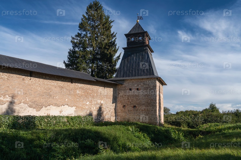 Вид на Благовещенскую башню Свято-Успенского Псково-Печерского монастыря в солнечный летний день, Печоры, Псковская область, Россия