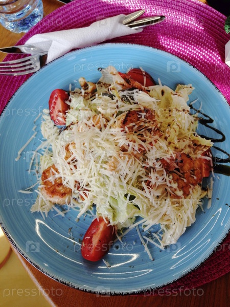 Концепция еды, салат Цезарь на блюде, вид сверху