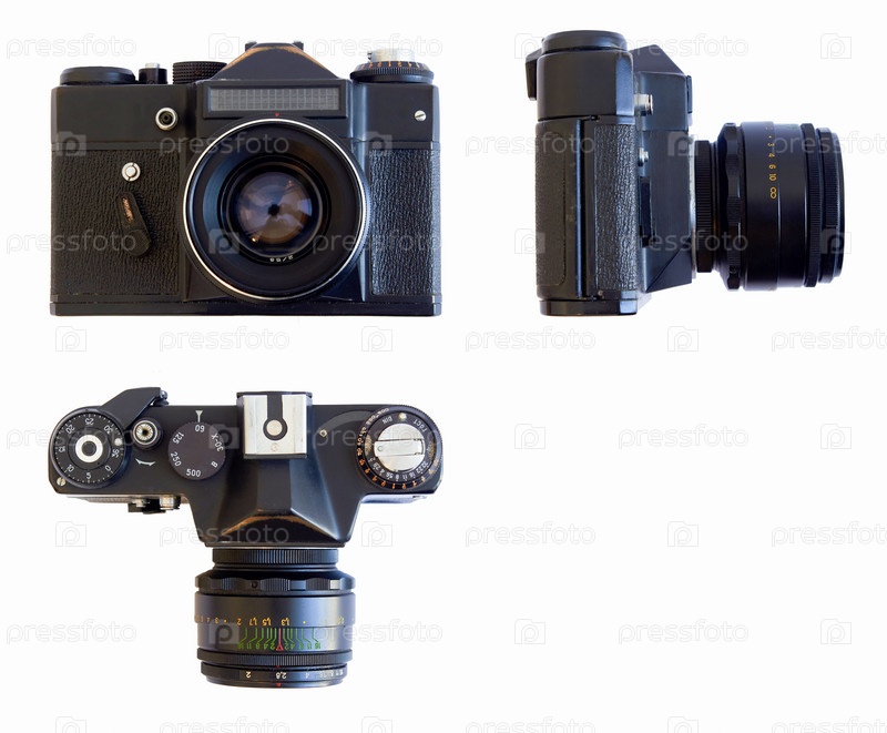 Винтажная фотокамера на белом фоне, вид с трех ракурсов