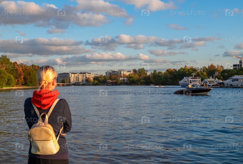 Молодая женщина с рюкзаком смотрит на реку и проплывающие лодки