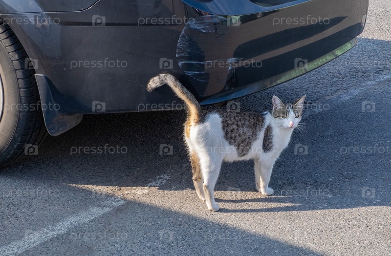 Бездомный уличный пестрый кот стоит возле припаркованной машины