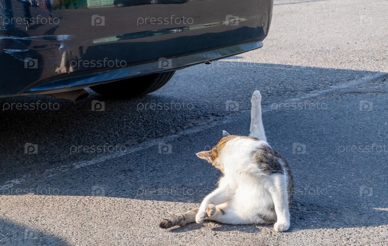 Бездомный уличный пестрый кот сидит возле припаркованной машины и моется