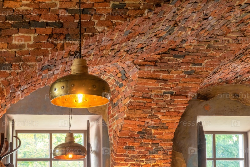 Медный, латунный или бронзовый светильник в стиле ретро на сводчатом потолке из красного кирпича