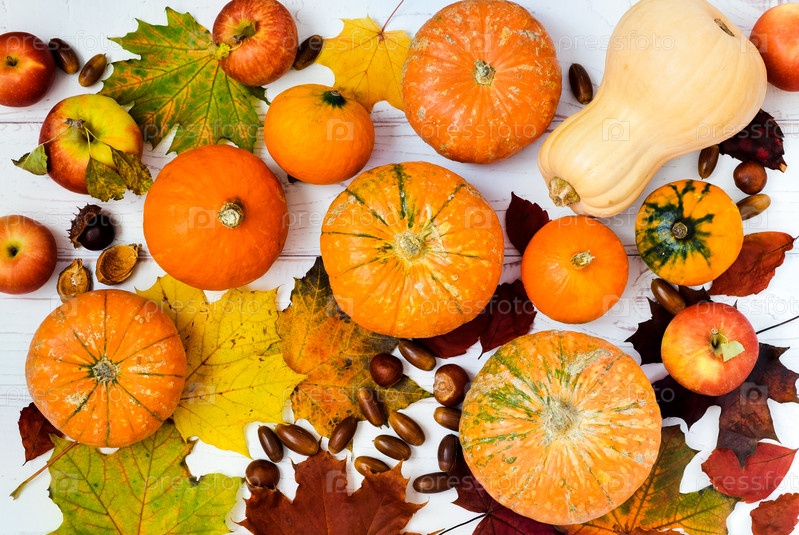 Композиция из маленьких ярких тыкв, яблок, лиственных листьев, каштанов и желудей