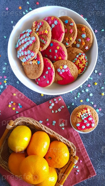 Рождественское печенье, мандарины в корзине на темном фоне с красным текстилем