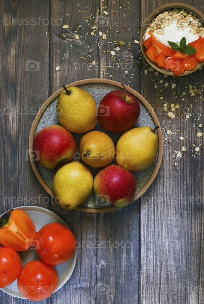 Яблоки, груши, хурма и йогурт с мюсли на деревянном фоне